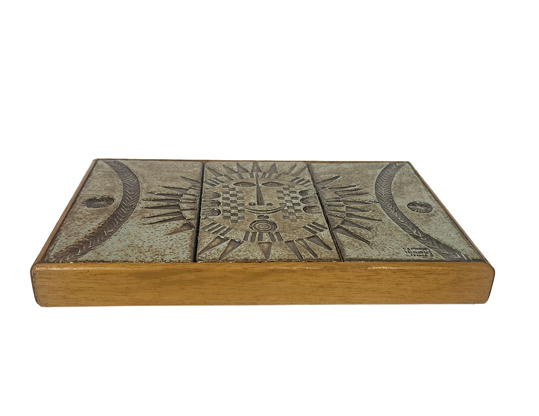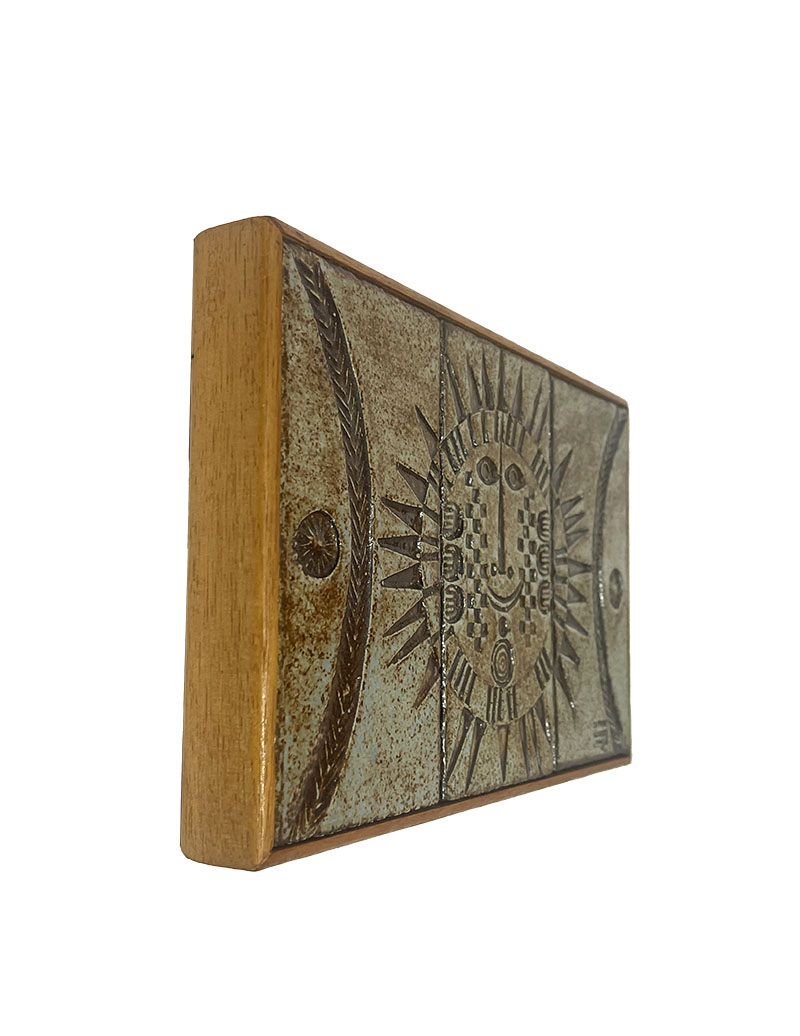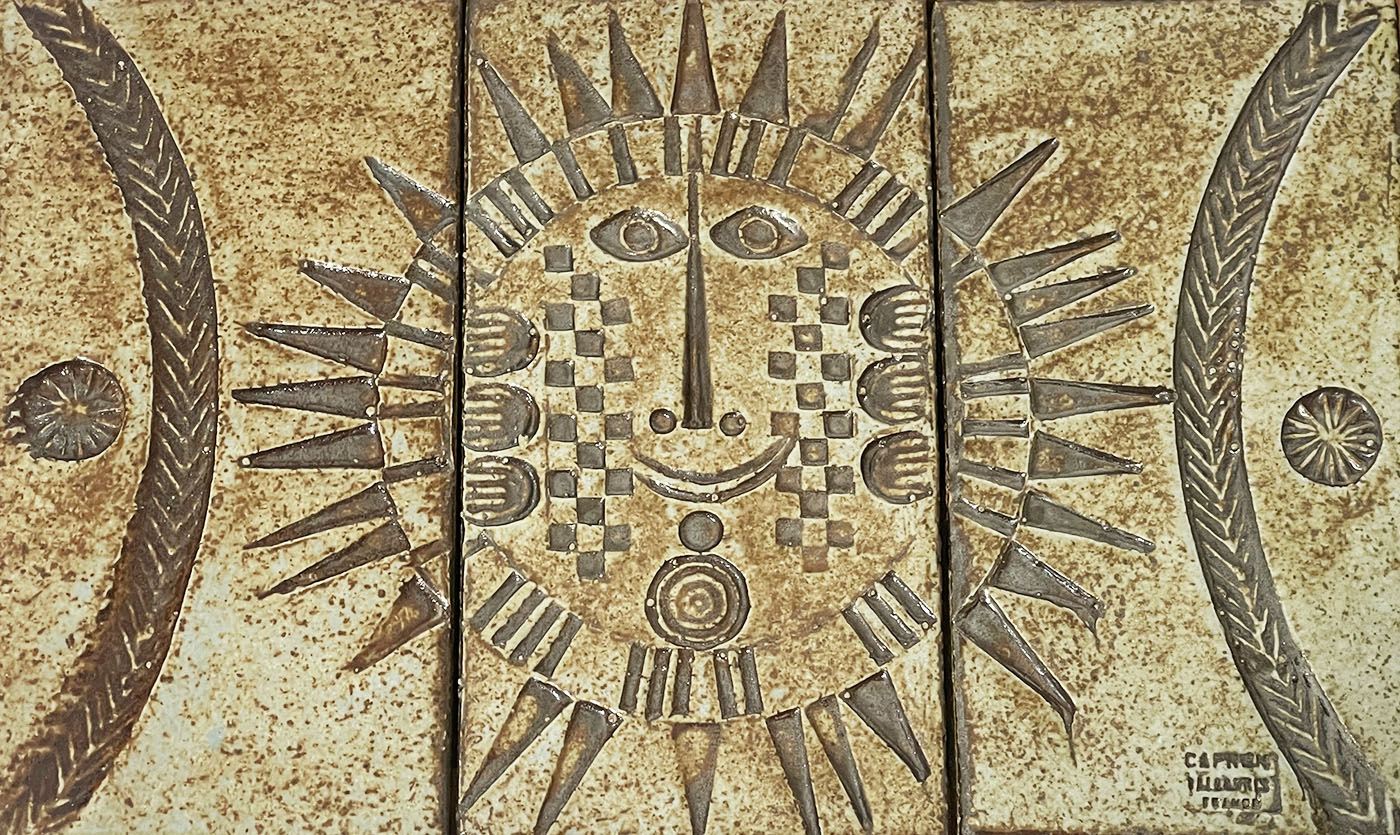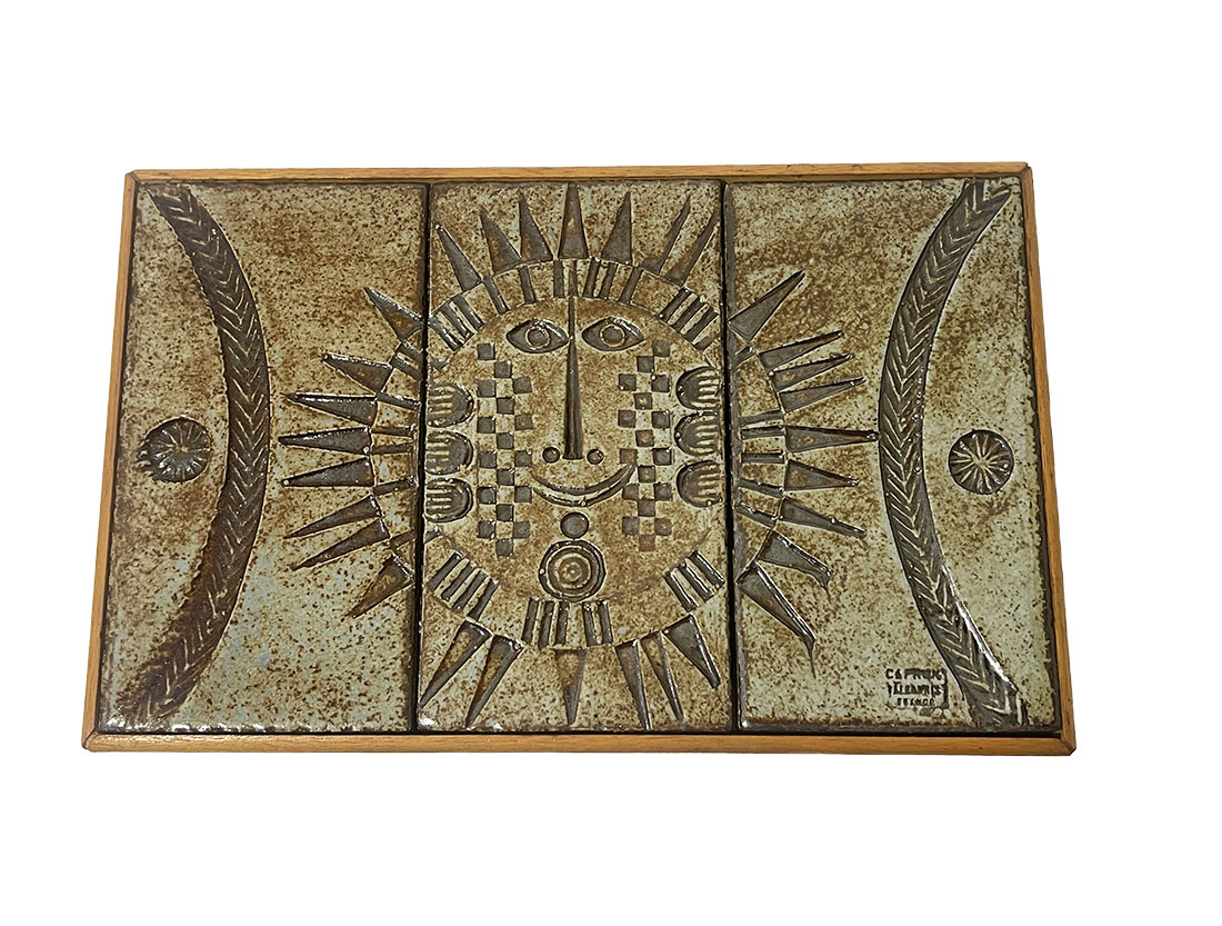 A wall hanging tile tableau with three small tiles in brown with a scene of the sun. Made by Roger Capron, French ceramist (1922-2006) Roger Capron moved to the South of France to Vallauris in 1946 and founded a ceramic workshop there called L' Atelier Callis.