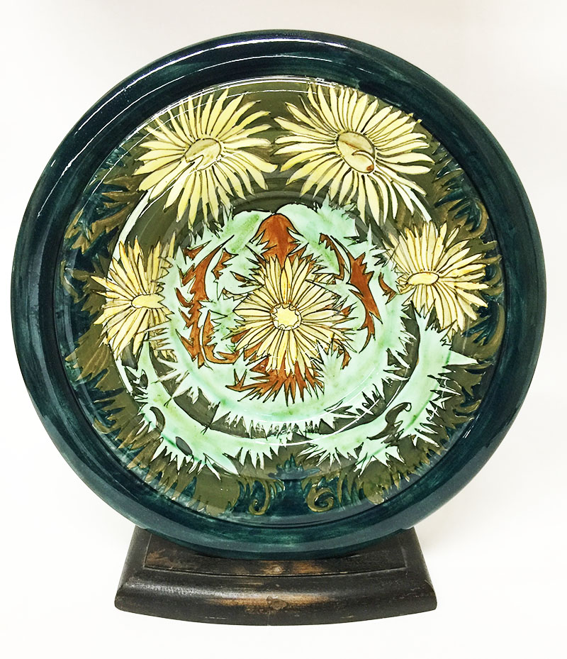 Rozenburg earthenware wall plate with decoration of the Thistle in green and yellow